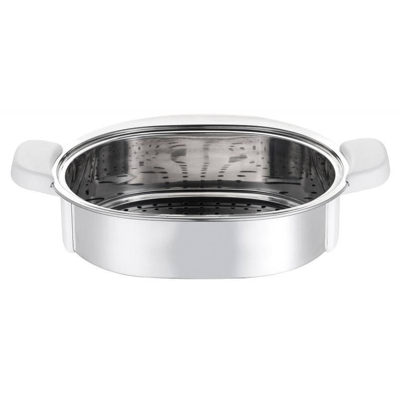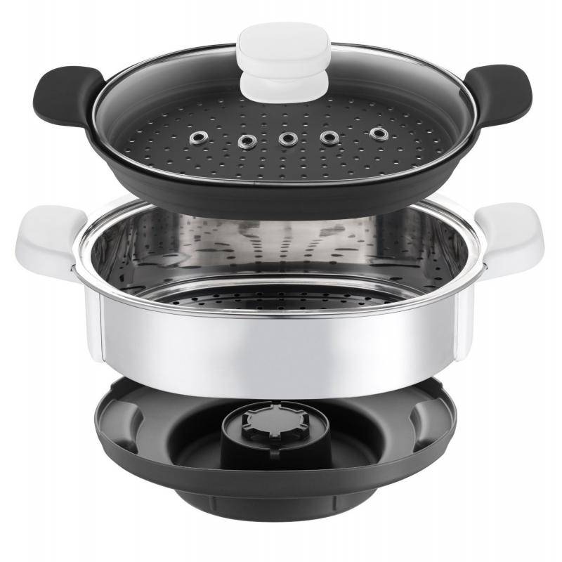 Il est composé ainsi : - bol vapeur inox de 3.7 L, - plateau vapeur, - collecteur de jus de cuisson, - couvercle transparent en verre pour surveiller la cuisson.